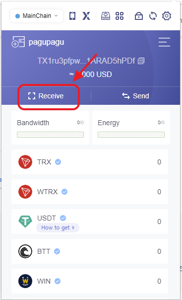 4-7. 이제 거래소 지갑에서 트론링크 지갑으로 트론을 보내기 위해 Receive 를 눌러 지갑 주소를 확인하자
