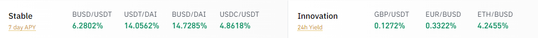 바이낸스는 이 변동성을 기준으로 GBP/EUR/ETH 풀들을 'Innovation' 이라 붙이고, 스테이블 코인 풀의 APY 표시와는 다른 방식으로 수익율을 표시해 주고 있습니다.