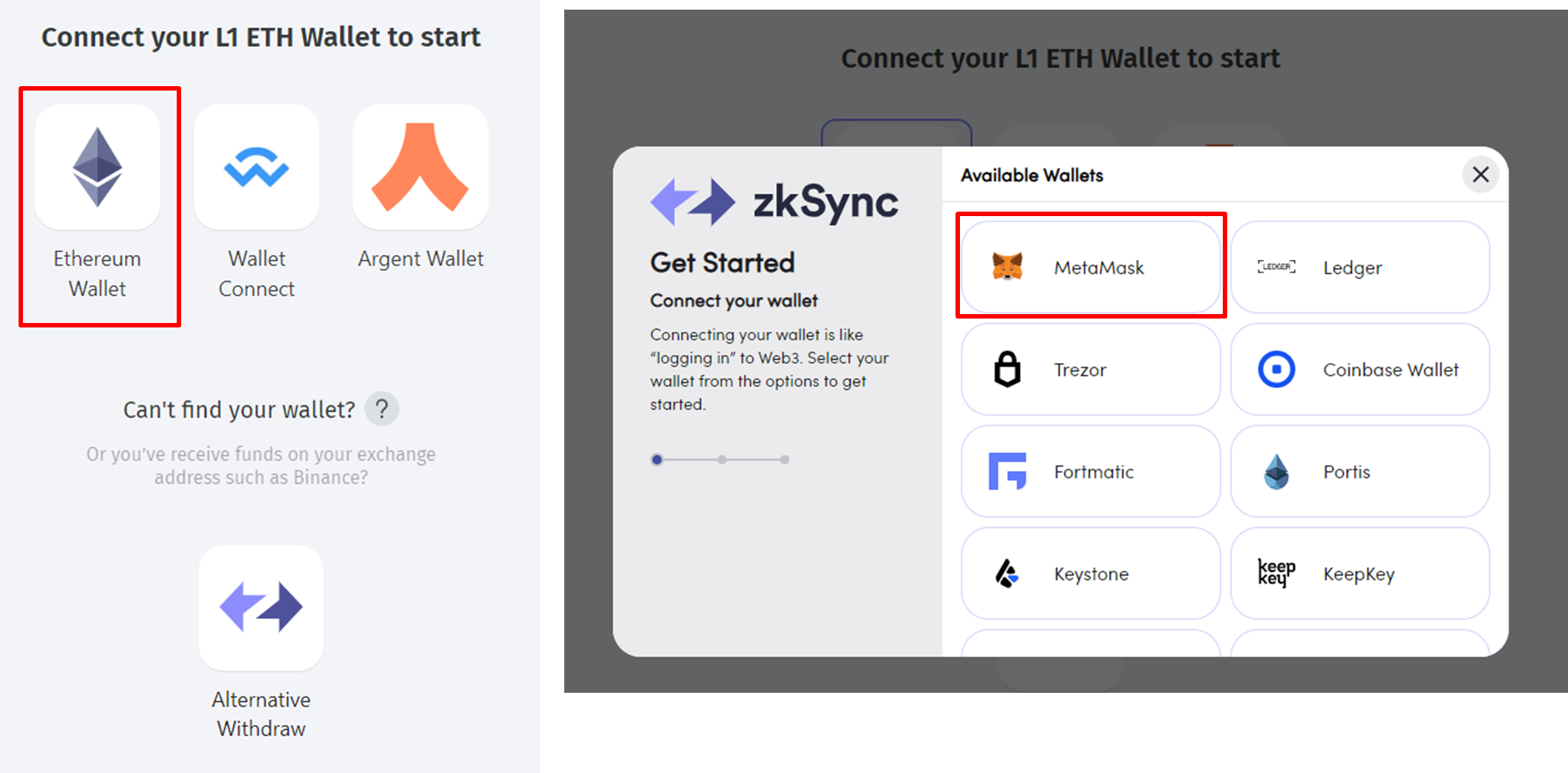 2/ Ethereum Wallet을 클릭 후, Metamask를 눌러서 기존에 사용하시던 이더메인넷의 메타마스크 지갑을 연결!