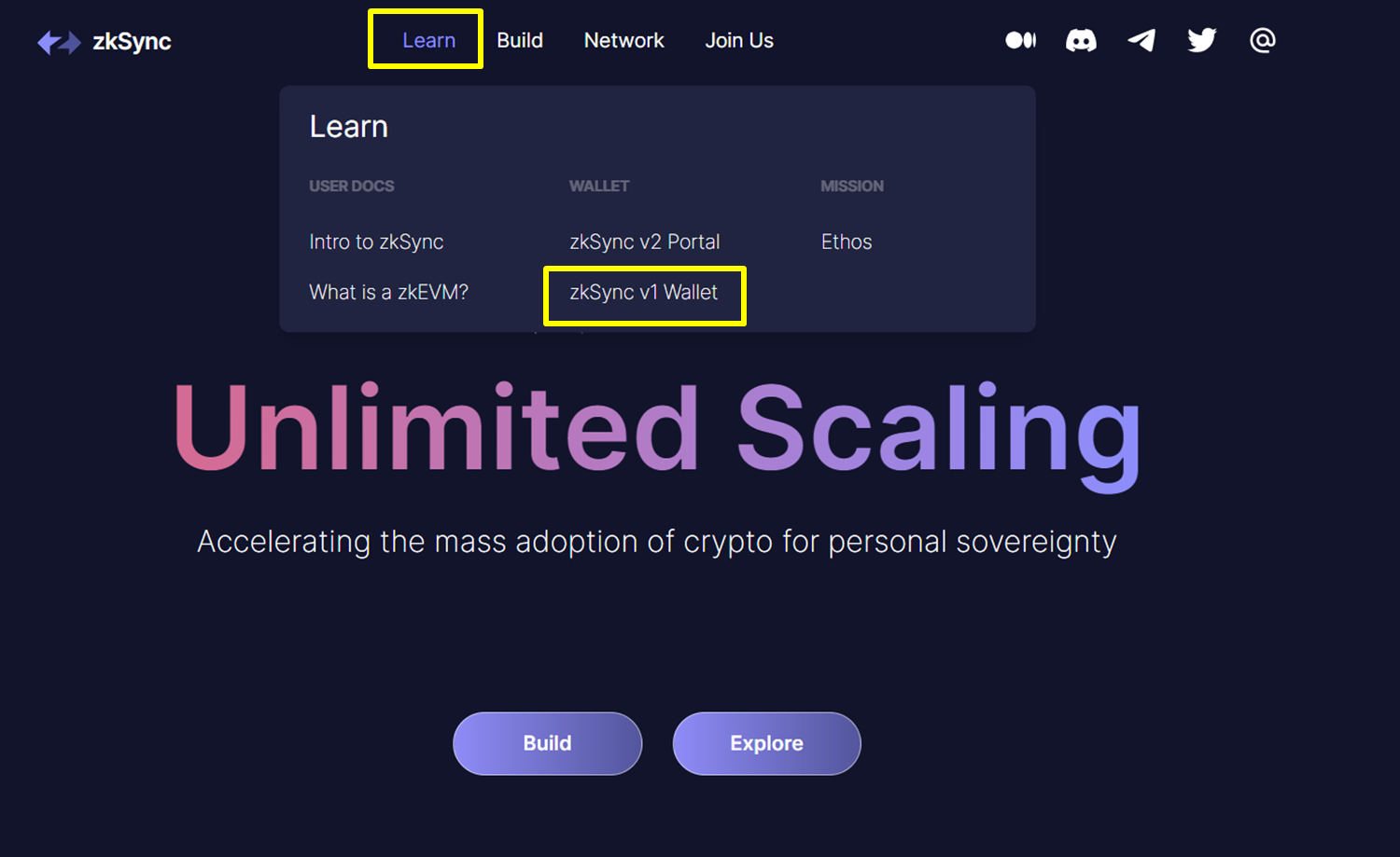 1/ zkSync.io에 접속하면 아래와 같이 'learn'탭을 통해 zkSync v1 Wallet으로 접속 할 수 있습니다.