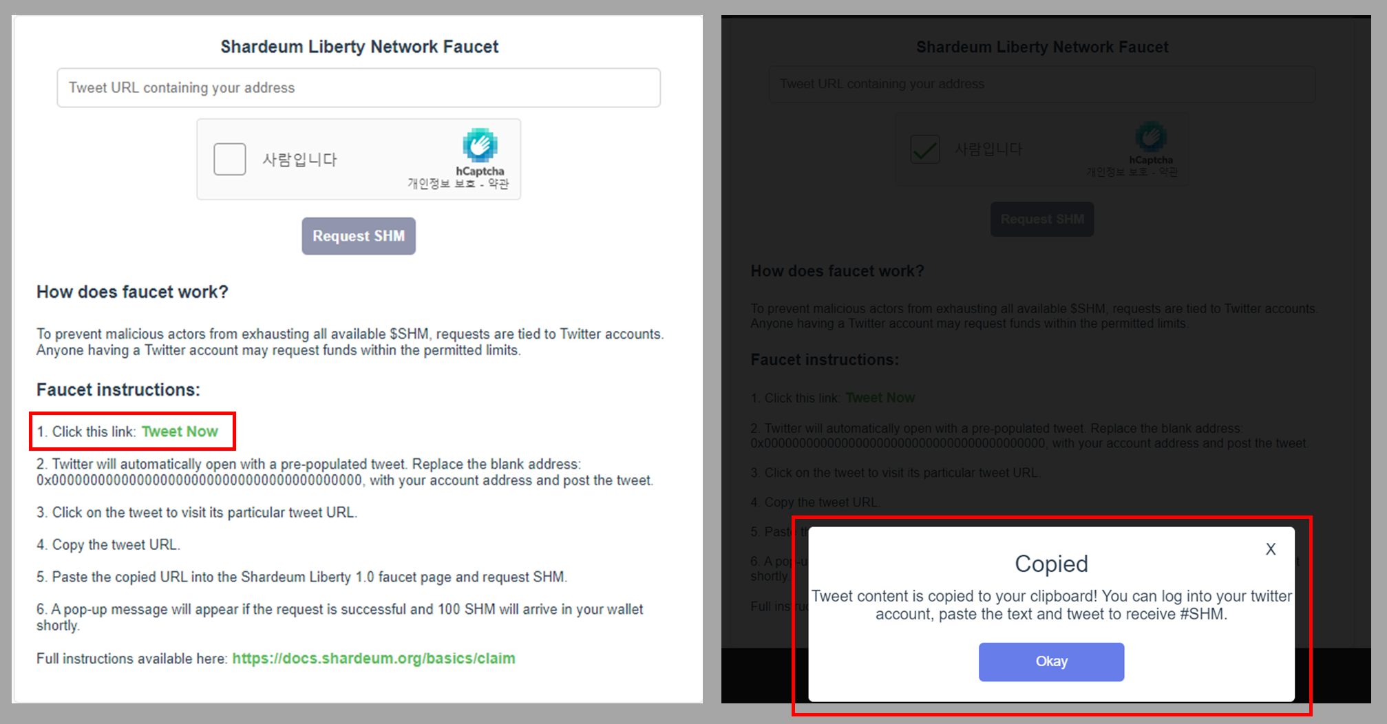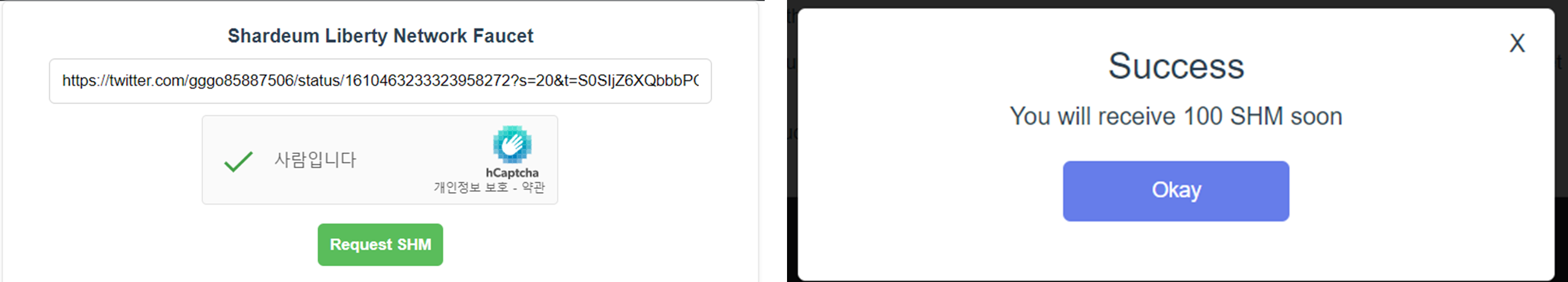 4/ 그리고 그 트윗의 링크를 복사해서 Faucet 페이지의 빈칸에 넣어주면 Request SHM 버튼이 활성화되고 이걸 클릭해서 토큰을 수령하면 됩니다. 한 5분에서 10분 후~ 100개의 SHM 토큰이 지갑에 들어온게되며 이걸 가지고 Shardeum 생태계 탐험을 하며 여러 트잭을 남기는 것입니다.