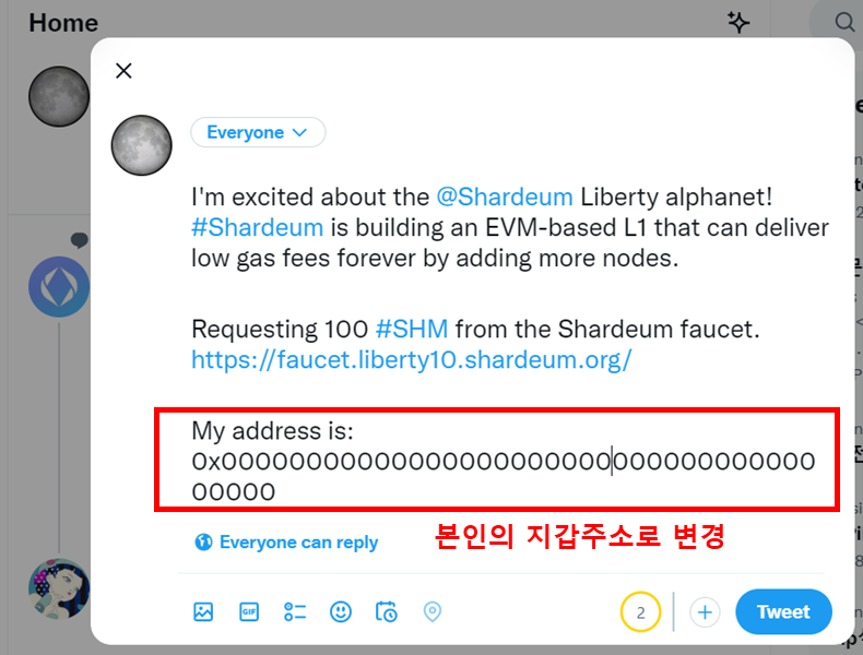 3/ 트윗하는 글의 맨 아래에 'My address is : '이 부분을 형님들 지갑 주소로 변경해주고 트윗!